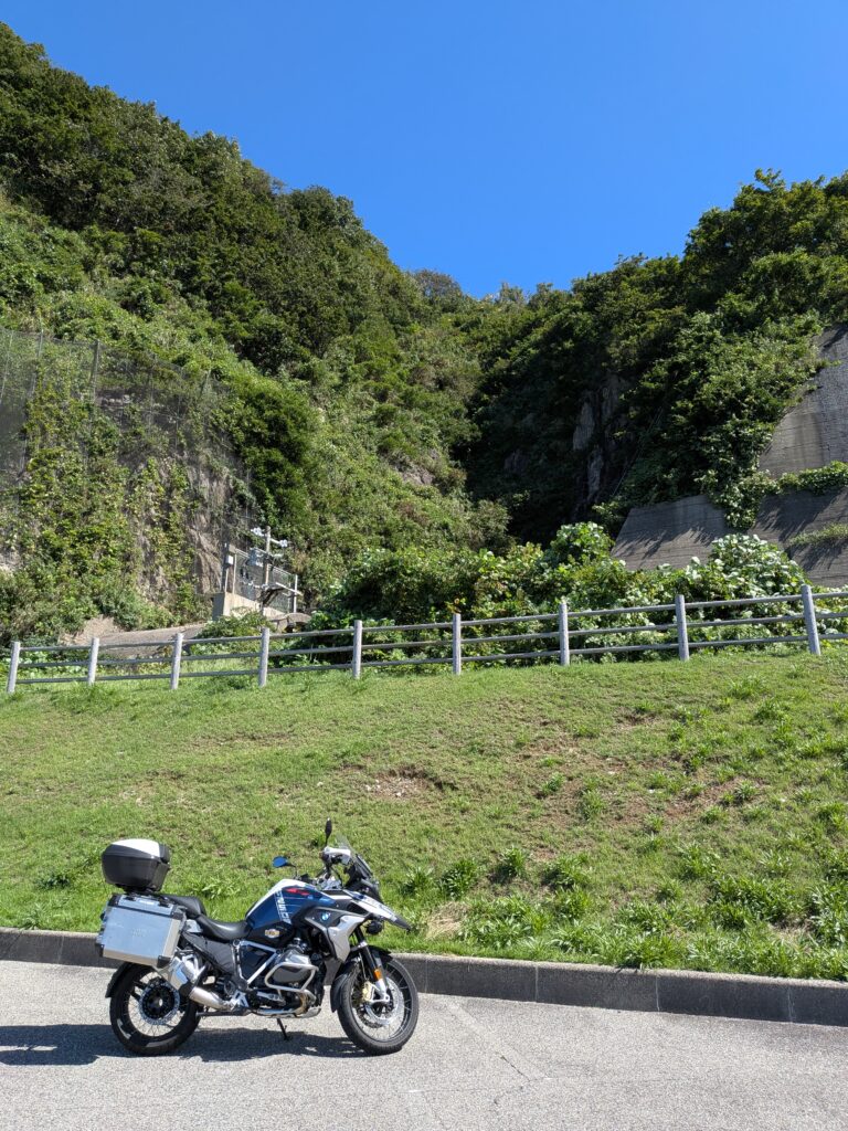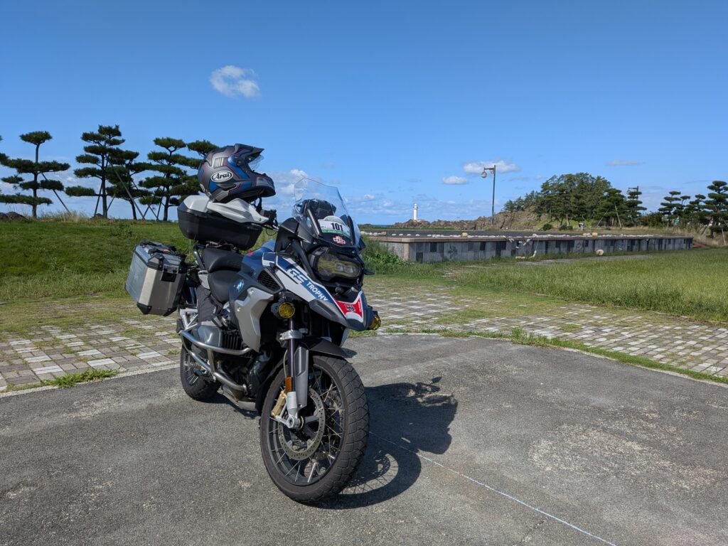 バイク越しに灯台と鳥居が見えるのですが、そこまで歩く元気が無かったので、この写真でおしまい。10:04にはここを出発。