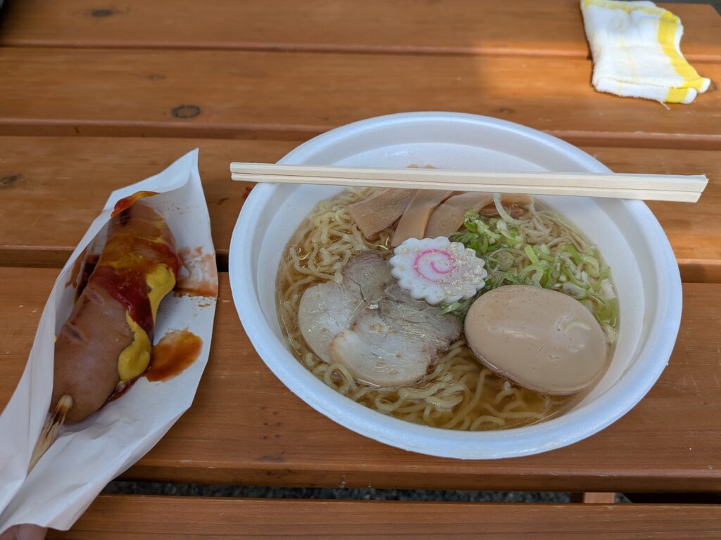 ここでランチです。レストランか何かあるだろうと思って入りましたが、どうやらありません。キッチンカーでラーメンをやってたので、ラーメンを食べました。