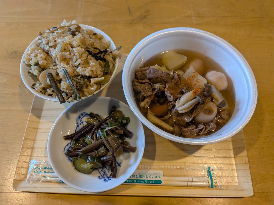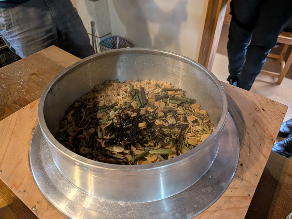 七ヶ宿源流米『やまのしずく』の炊き込みご飯、芋煮、わらびときゅうりの漬物 全てが美味。