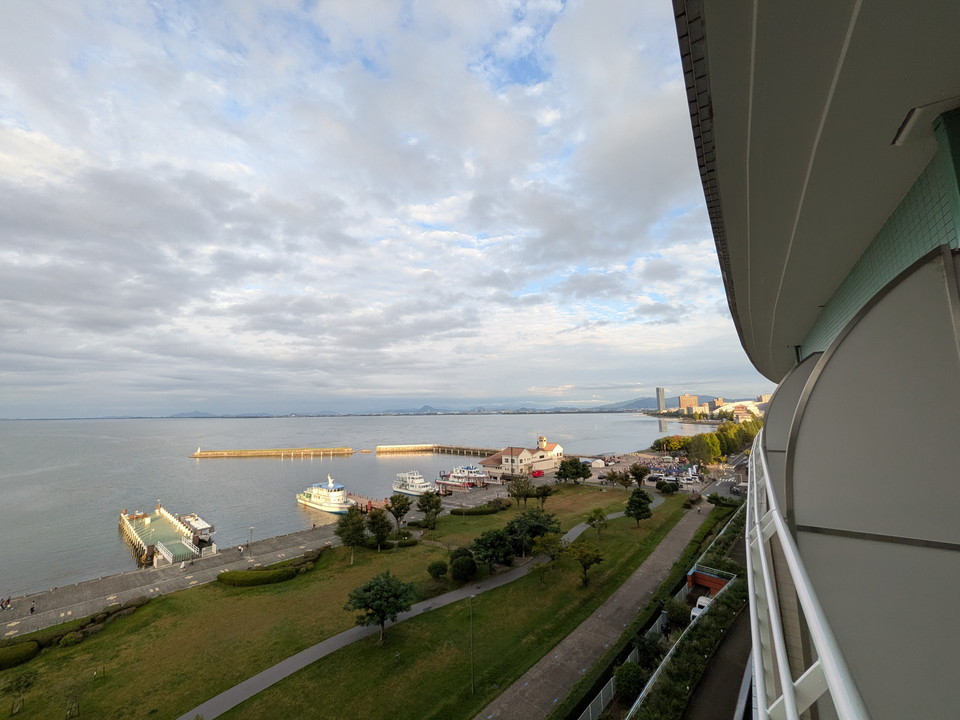 夜のパーティーがメインなので、行き先はいつもよりは近場、大津市にある琵琶湖ホテル。私にはあまり縁の無い全室レイクビュー&高級リゾートホテルです。右奥にダイヤモンドヘッドがあれば、ハワイです。