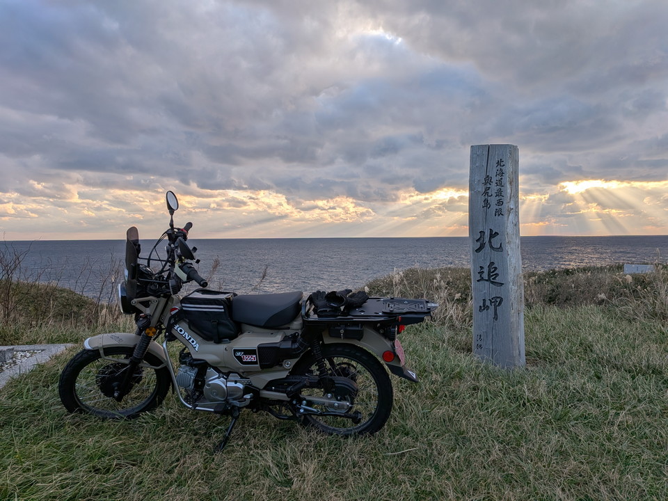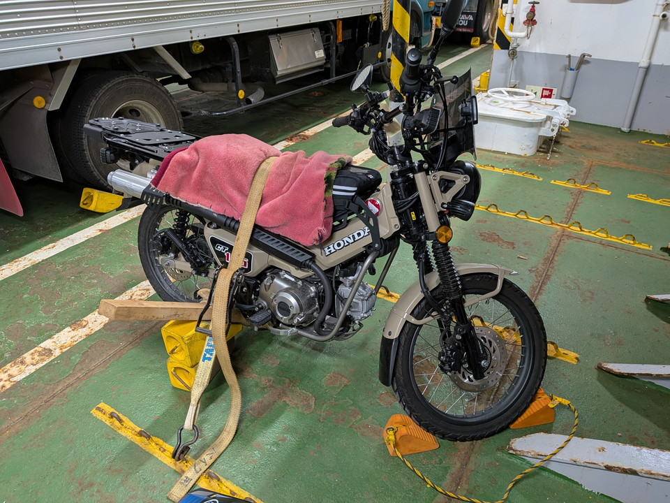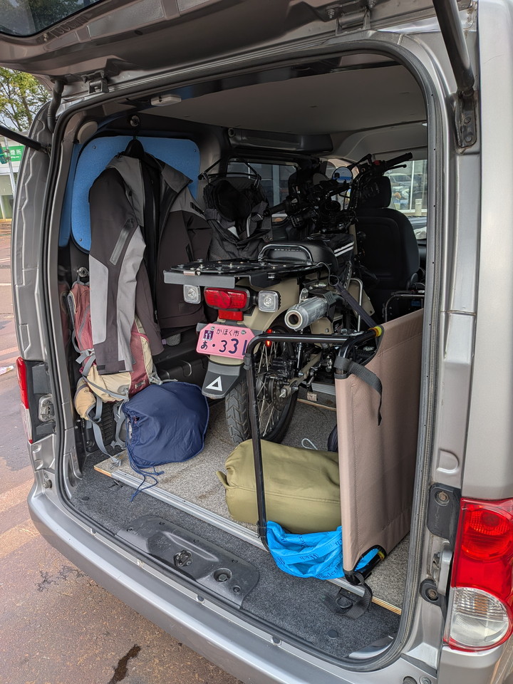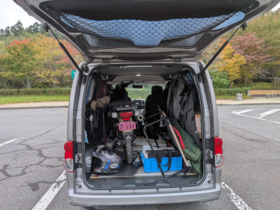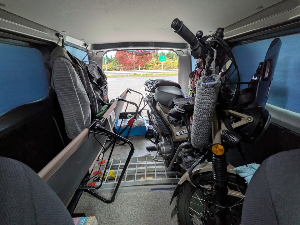 ただ、既に10月下旬。バイクで北海道に渡るには、ちと遅すぎます。そこで、今回は、ハンターカブ(CT125 JA55)をNV200でトランポして出掛けました。