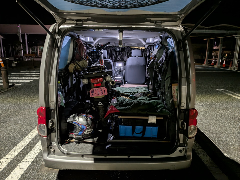 ここで、私のNV200での車中泊仕様を紹介します。最初の2枚が走行中のスタイルになります。後の2枚が就寝時のスタイルです。使っているコットはColeman製で床からの高さがあるので、下に荷物を置く事が出来ます。