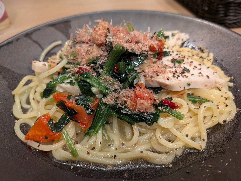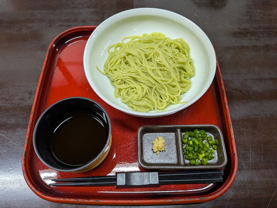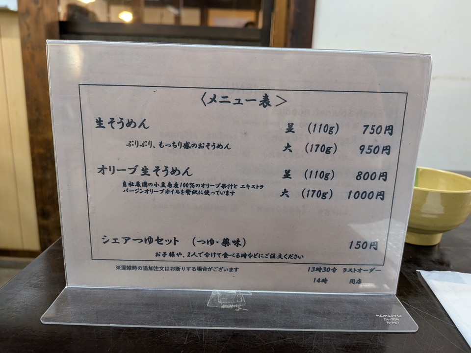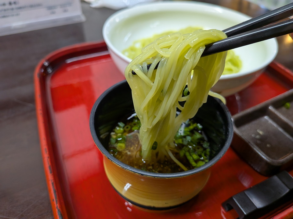 オリーブ生そうめん(¥800)なるものをオーダーしましたが、10分程度で出てきました。少し緑色したそうめんです。オリーブが練り込んであって、まあまあ旨かったです。12:14に、ここを出発。