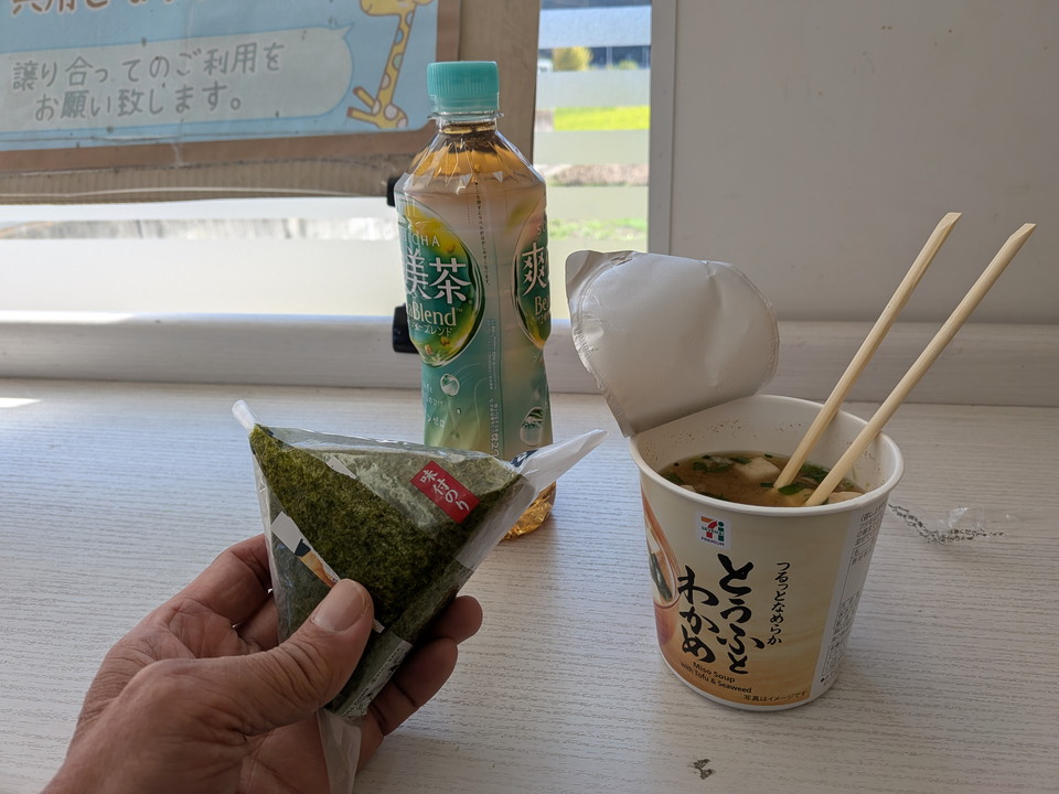 その後、12:00過ぎにセブン-イレブン 井原芳井町店でおにぎりとカップ味噌汁を頂きました。こんなランチも有りですね。12:23にここを出発。
