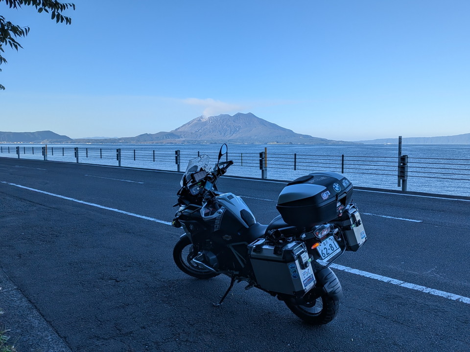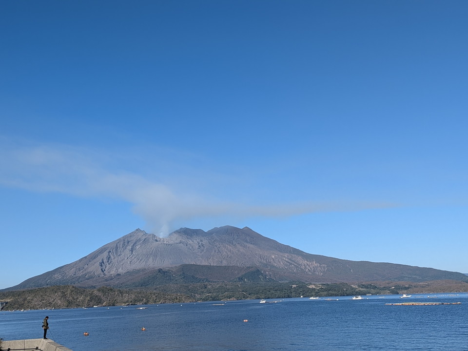 南下中、右前方に見える桜島。11/16の最大噴煙4400mあがる連続噴火の影響はさほど感じられません。とても綺麗です。